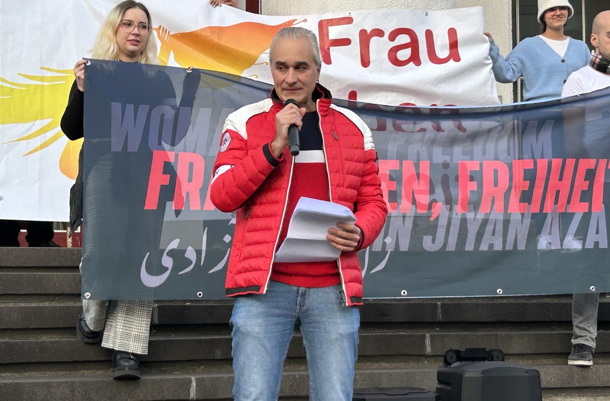 Ein parteiübergreifendes Bündnis hatte zu der Kundgebung aufgerufen. Christian Saris, Mitorganisator der Veranstaltung und Mitglied im Rat der Stadt Duisburg in der Fraktion der Grünen, moderierte die Veranstaltung. In der ersten Rede machte Parisa Tonekaboni, Ratsfrau der Grünen und Islamwissenschaftlerin klar, dass eine Verhandlungslösung mit den Islamisten in Teheran nicht möglich sei. Der Ruf nach weiteren Sanktionen zog sich durch die ganze Veranstaltung: Deutschland ist der wichtigste Handelspartner des Iran, wie Tomás Santillan (Die Linke Rheinisch-bergischer Kreis) betonte, und die Gewinne kommen direkt der iranischen Revolutionsgarde zugute.