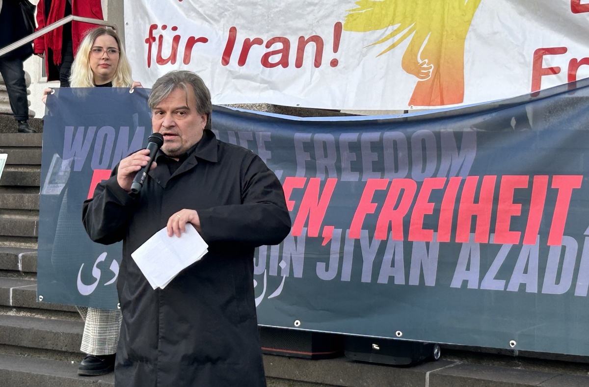 Die Redner auf der Kundgebung hatten klare Forderungen an die Bundesregierung und die EU um die Demokratiebewegung im Iran zu unterstützen.