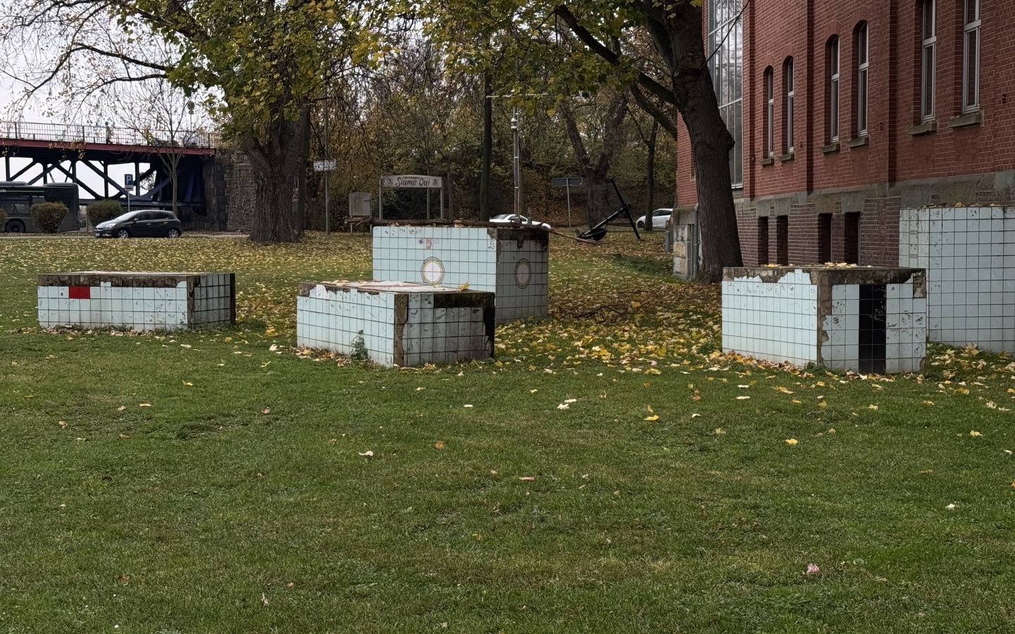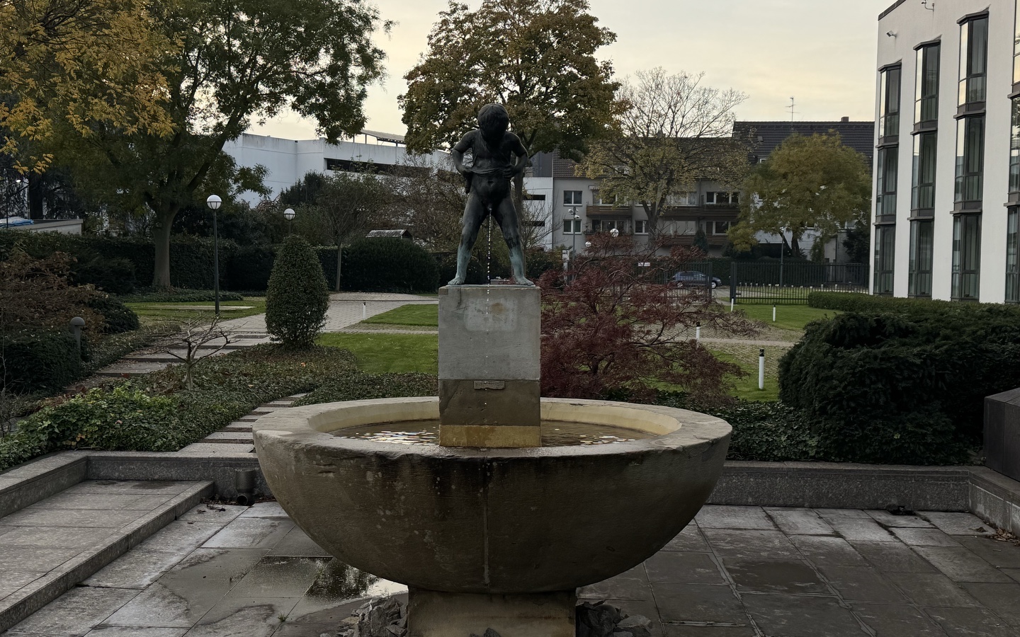 Die letzten Stationen unserer Tour sind die Schifferbörse, der historische Dampfdrehkran und – nach kurzer Fahrt über die Rheinbrückenstraße (Ein absoluter Hotspot in Bezug auf Lost Einkaufswagen! Sechs Fundstücke auf drei Locations verteilt!) – die Skulptur Männeken Pis, das früher auf dem Sonnenwall im Epizentrum von Duisburg seinen Platz hatte, in den 2011 ins Lehmbruck-Museum kam und jetzt umzäunt, aber einsehbar, auf dem Haniel-Gelände auf der Harmoniestraße seinen Platz gefunden hat.