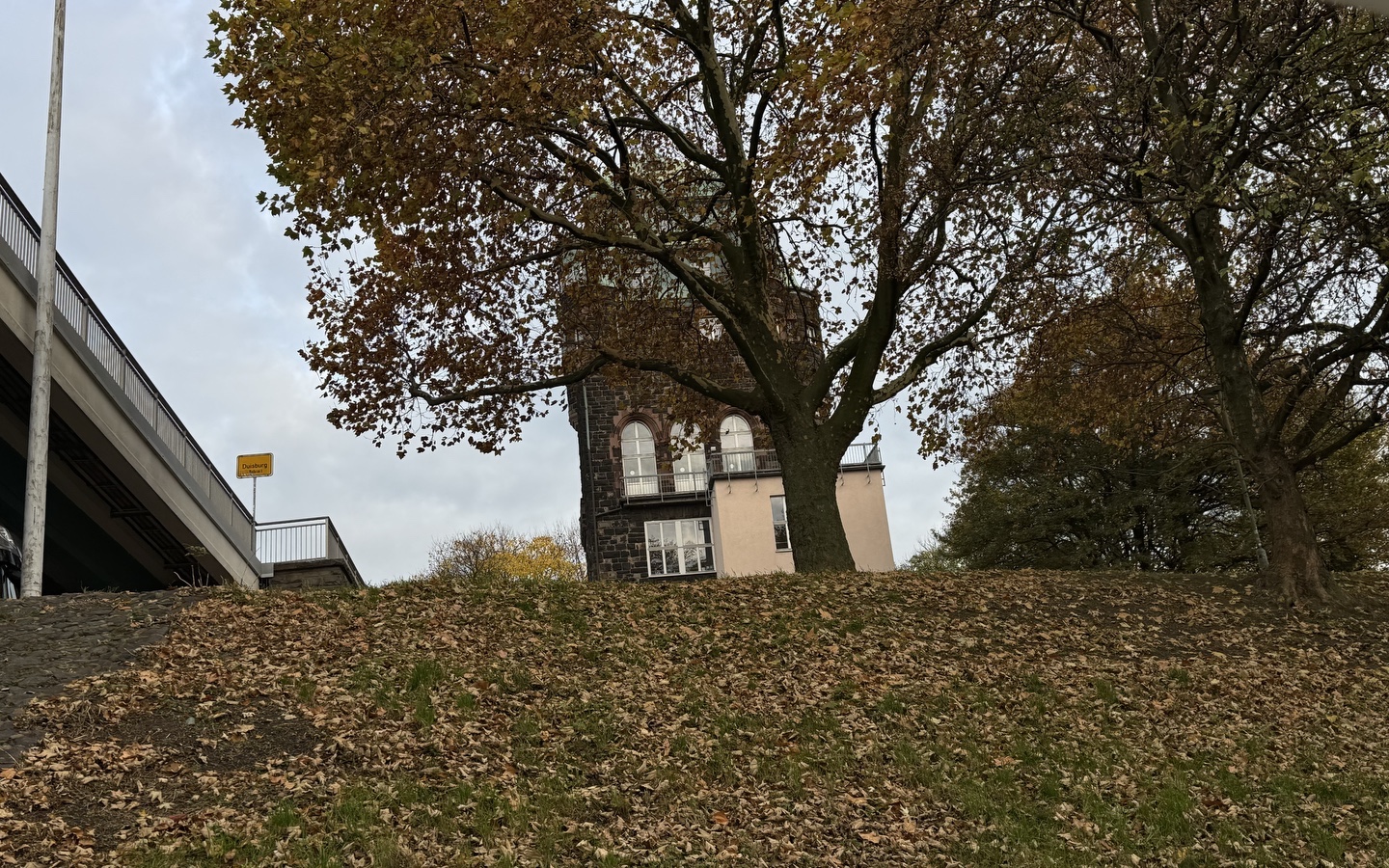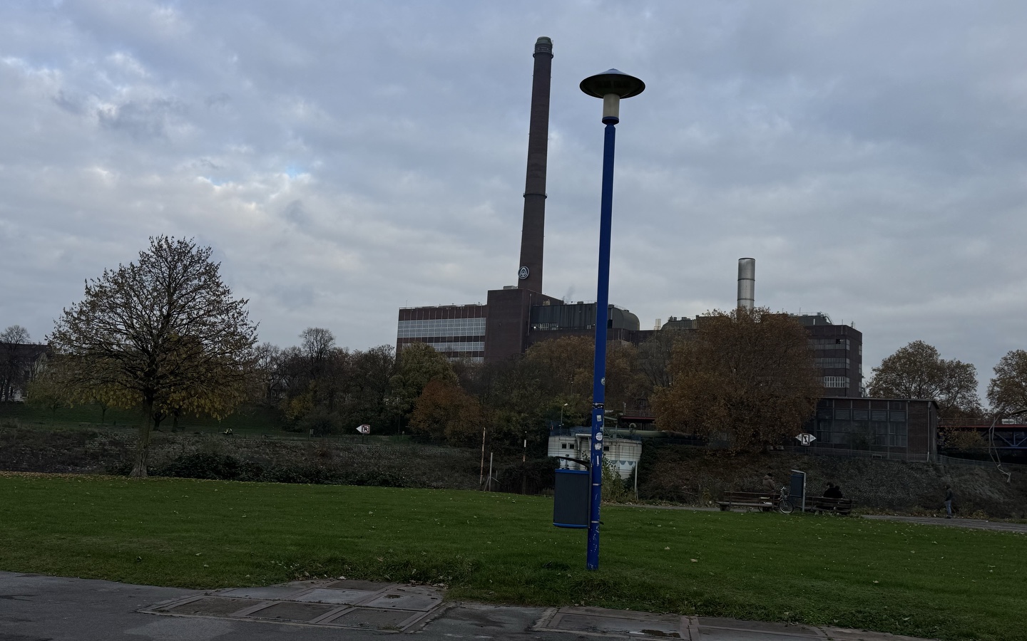 Wir sind (fast) eine Stunde unterwegs, die Tour neigt sich dem Ende zu: Wir passieren Zum Hübi, eine Kneipe direkt neben der Horst-Schimanski-Gasse, von der man einen direkten Blick auf die Oskar Huber hat. Auf der anderen Seite des Rheins steht eine neue Logistikhalle, nicht unumstritten in Ruhrort, weil sie den Blick auf die Rheinorange nimmt. Ob diese Skulptur wirklich schöner ist als die Logistikhalle (Die man auch orange streichen könnte!), liegt wohl im Auge des Betrachters.