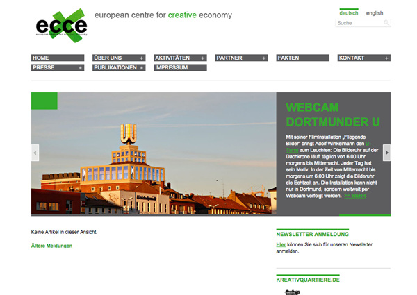 Vor ein paar Wochen, ich war gerade auf dem Weg zu einer Performance im Dortmunder U-Turm, kam ich an den Büros von ECCE vorbei. Es brannte Licht in ihnen und ein Mensch saß an einem Computer und blickte auf einen Monitor. „Ach schau an,“ dachte ich versonnen während ich durch den kühlen Nieselregen lief und versuchte, mich vor dem Wind zu schützen, „die gibt es immer noch“ und erinnerte mich an all die kleinen und unterhaltsamen Streitigkeiten die dieses Blog mit dem ominösen European Centre for Creative Economy in all den Jahren die da hinter uns liegen hatten.