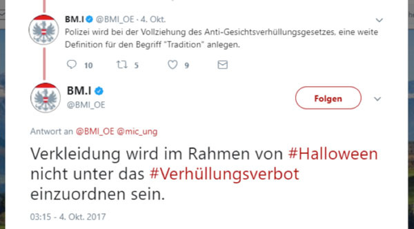 Nein, natürlich nicht sturmfrei, denn das Bundesministerium für Inneres hat dann via Twitter recht zügig auf die Auslegung der Landespolizeidirektion Niederösterreich reagiert und somit wohl abertausende Halloweenparties gerettet, indem man kurzweg Halloween als ein weitläufig traditionellen österreichischen Brauchtum anerkannt hat. Glück gehabt.