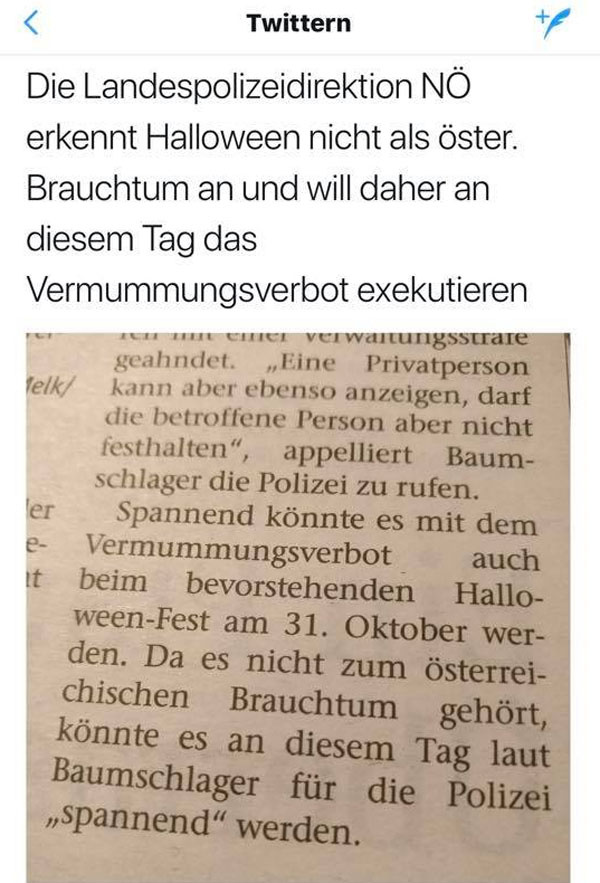 Es begann bereits damit, dass die Landespolizeidirektion Niederösterreich ZUNÄCHST Halloween nicht als Brauchtum anerkannte und somit ankündigte, das Gesetz durchzusetzen. Wäre vielleicht mal die ideale Lösung für Eltern gewesen, ihre Kinder für eine Nacht loszuwerden, denn so ein Kind ohne Ausweis, dessen Identität nicht festgestellt werden kann, es dann noch trotz Abmahnung die strafbare Handlung fortsetzt, indem es sich weigert die Verhüllung zu entfernen oder versucht, die Tat zu wiederholen, könnte von einem Polizeibeamten auf die Polizeistation gebracht werden. Also sturmfrei für die Eltern an Halloween?