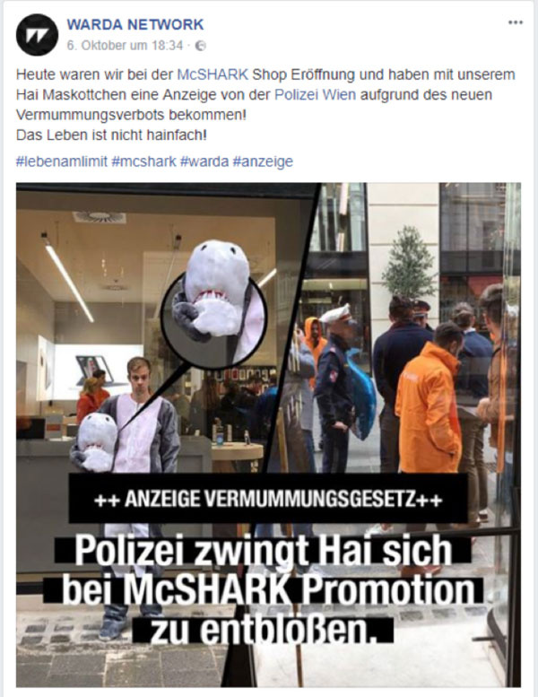 Ein Promo-Mitarbeiter, der ein Hai-Kostüm trug, musste im Zuge des Verbotes nun die Haimaske abnehmen. Dazu gab es eine Anzeige. Der Mann war Teil einer Promo-Aktion vor einem neueröffneten McShark-Geschäft in der Wiener Innenstadt. Ist natürlich nun für den Shop eine nette Promo im Nachhinein, jedoch insgesamt auch hier bedenklich, da der junge Mann seine beruflichen Pflichten ausübte.