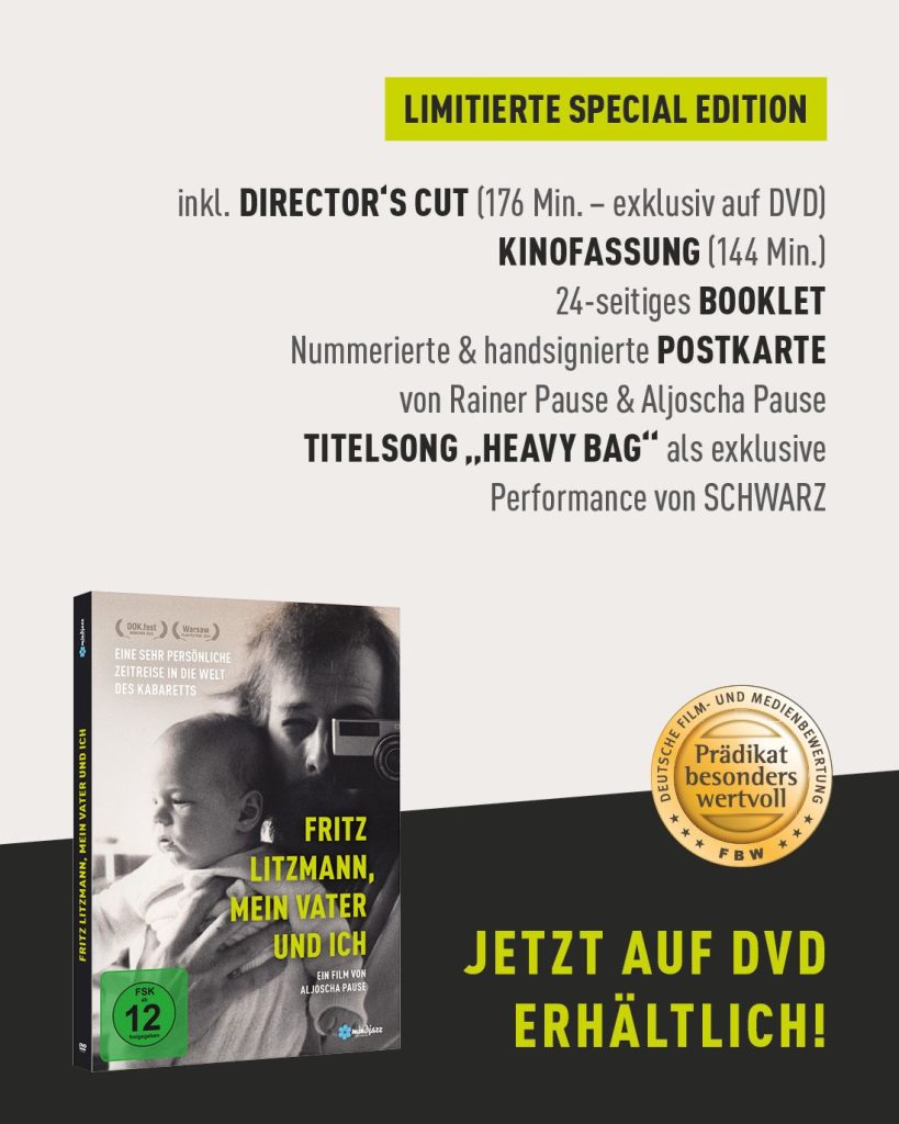 Nun haben endlich alle, die damals nicht im Kino dabei sein konnten, die Gelegenheit, den Film zu entdecken: Ab dem 30. Oktober erscheint „Fritz Litzmann, mein Vater und ich“ in einer aufwendig gestalteten Limited Edition DVD-Box, die ab sofort im Pantheon Theater in Bonn erhältlich und bereits vorbestellbar ist.