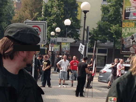 Genau 46 Nazis ziehen zur Zeit bei einer von Christian Worch in seiner Funktion als Parteivorsitzender von „Die Rechte“ angemeldeten „Antikriegstag“-Demonstration durch Dortmund. Vor dem Verbot der Nazi-Kameradschaft Nationaler Widerstand Dortmund kamen zu den Antikriegstag-Demos zum Teil  über 1000 Rechtsradikale aus dem In- und Ausland. Das rechte Häuflein wird immer wieder von Gegendemonstranten beschimpft und ausgebuht.