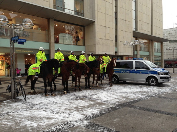 Ich glaube nicht, dass die Reiterstaffel da speziell wegen uns da gewesen ist – ich denke eher, dass die generell mal „Auslauf unter realistischen Bedingungen“ brauchten, quasi ein Trainingsausritt.