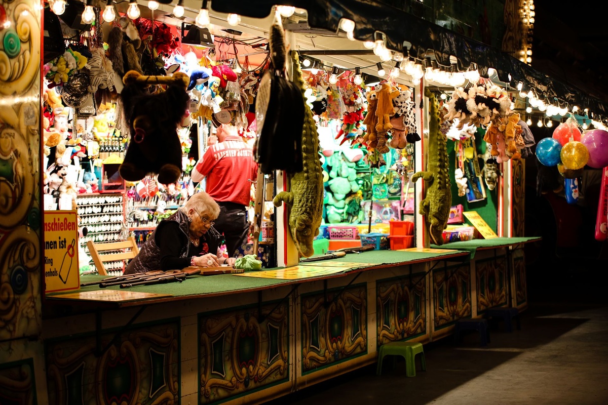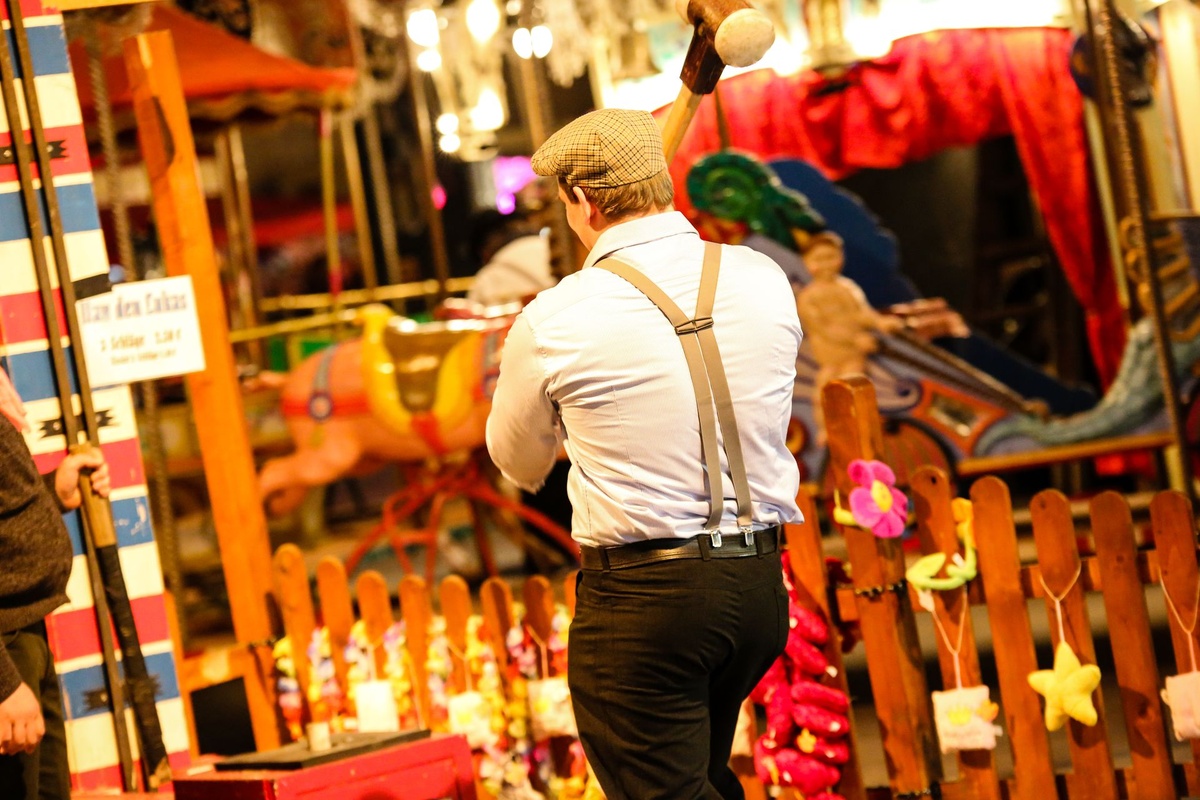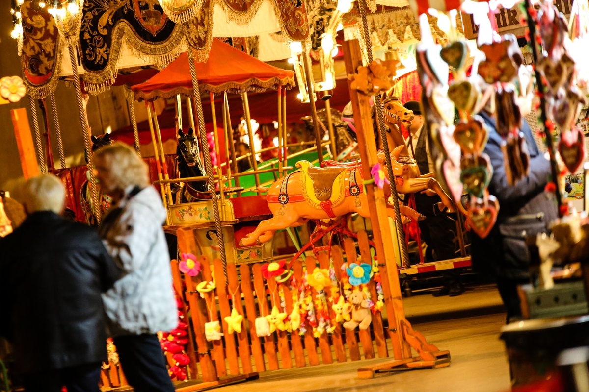 Und es ist den Veranstaltern und auch den Schaustellern ausserordentlich gut gelungen, eine Atmosphäre zu schaffen, die einen in vergangene Zeiten eintauchen läßt. Schon beim Betreten der großen Halle wird man von den vielen bunten Lichtern, Drehorgelklängen und dem typischen Jahrmarktstreiben eingefangen und ich denke, egal wie alt man ist, es ist eine Attraktion für alle Generationen. Und auch gestern füllte sich im Laufe des Abends die „Jahrmarkthalle“ immer mehr und die Stimmung war sehr ausgelassen. Die Klassiker, wie die Raupe, das Riesenrad, der Autoscooter, das Pferdekarussel und die Überschlagschaukel standen nicht still, und auch die anderen zahlreichen Angebote, wie Hau-den-Lukas, die Geisterbahn, das Entenangeln und die Schießbuden fanden großen Anklang.