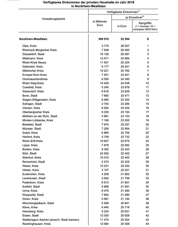 Das statistische Landesamt NRW hat heute das verfügbare Einkommen der privaten Haushalte veröffentlicht und die Daten zu einem Ranking zusammen gefasst. Auf den Punkt gebracht: Im Ennepe-Ruhr-Kreis und in Mülheim können sich die Menschen ab und an Flaschenbier von Marken leisten, die im Fernsehen beworben werden. Der Rest trinkt Hansa aus der Dose. Nur in Gelsenkirchen reicht es auch dafür nicht: Dort spritzt man sich, um lustig zu werden, etwas Mümmelmann, den günstigen Kräuterlikör von Aldi, in die Vene.