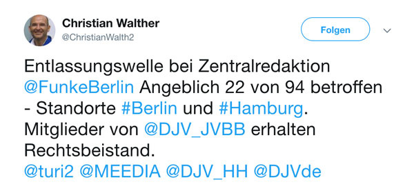 Nach einem Bericht des Branchenmagazins Horizont wird die Funke-Mediengruppe, die neben der WAZ auch das Hamburger-Abendblatt, die Thüringer-Allgemeine herausgibt und am Standort Berlin eine Zentralredaktion unterhält und Berliner Morgenpost veröffentlicht, weitere Stellen abbauen. Die Druckerei in Essen mit 120 Mitarbeitern soll geschlossen werden. Weitere Einsparung sind offenbar bei den Mitarbeitern der Berliner Zentralredaktion, in Hamburg und in Thüringen geplant.