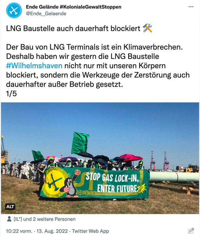#EndeGelände for the win! Gestern hat EG in Wilhelmshaven nicht „nur“ blockiert, sondern „Sachbeschädigung für Klimagerechtigkeit“ (aka #friedlicheSabotage) durchgeführt, & so den „Rahmen des Machbaren“ für die ganze Klimabewegung erweitert. Danke @Ende__Gelaende 🙏✊❤️ https://t.co/qxlF11x3tM