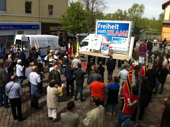 Auch Gäste waren da: Eine Frau von der FPÖ aus Österreich und eine von Vlaams Belang. Muslime böse, Bedrohung ganz schlimm, Pro NRW prima – das alles in komischen Dialekten und gebrochenem Deutsch. Das Gleiche von Rolf Schlierer, dem Chef der Republikaner. Ja, die gibt es noch – und in NRW unterstützen sie Pro NRW.