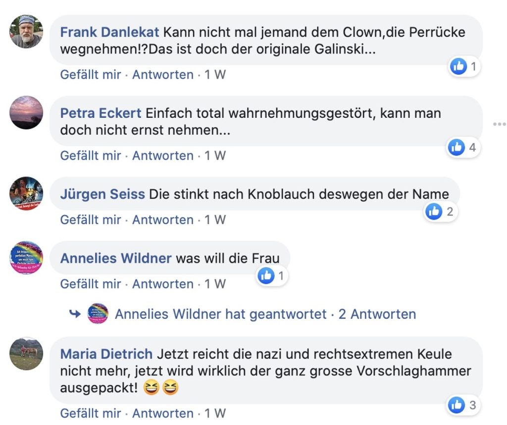Kommentiert und reglementiert werden diese Kommentare nicht. Was interessant ist, wenn man sich ansieht wer in der Gruppe sonst so Mitglied ist und dort schreibt: Wie z.B. Jörg Nobis (Vorsitzender der AfD-Fraktion im Landtag von Schleswig-Holstein), Frank-Christian Hansel und Gunnar Lindemann (Beide Mitglieder im Berliner Abgeordnetenhaus!).