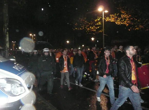 Die Polizei folgte dem friedlichen Zug mit über 20 Einsatzfahrzeugen. Außer ein paar Feuerwerksraketen und Böllern, die von den eigenen Leuten mit Buhrufen quittiert wurden, blieb alles ruhig. Am Stadion, wo die Fans beider Fußballvereine aufeinander trafen, war ebenfalls starke Polizeipräsenz. Die Polizei war durchweg professionell und wirkte deeskalierend auf die Situation ein. Obwohl der Fanzug durch die Borussenfans hindurch zum Eingang zog, blieb auch auf dem Stadionvorplatz bis zum Einlass alles friedlich. Nur eine kurze Ingewahrsamnahme eines Galatasaray-Fan war zu beobachten.