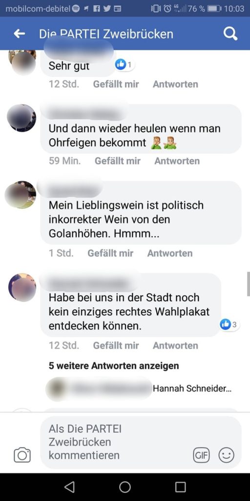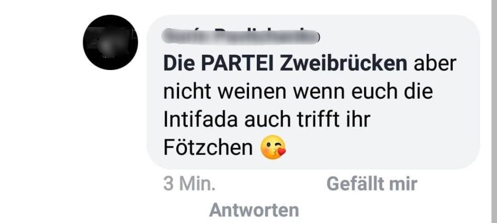 Es gab unschöne Nachrichten an DIE PARTEI Zweibrücken. Auf der Facebookseite der PARTEI gibt es unschöne Kommentare. Einen Auszug davon gibt es hier im Beitrag zu sehen.