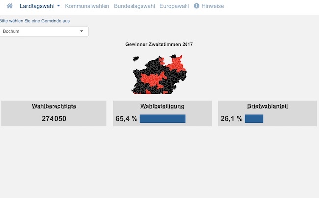 „Die Idee ist gut, doch die Welt noch nicht bereit“ sangen in den 90er Jahren Tocotronic und so ist es auch mit dem Interaktives „Dashboard Wahlen Nordrhein-Westfalen“, das nun vom Statistisches Landesamt freigeschaltet wurde. es bieten Antworten auf Fragen wie Wie sich die Erst- bzw. Zweitstimmenanteile in den Gemeinden verteilen und wie hoch der Anteil der Briefwähler war. Nur leider ist das Dashboard so fluffig wie ein Knäckebrot: Die NRW-Karte ist zu klein und lässt sich nicht vergrößern, das ganze Dashboard zu lahm. In entwickelten Ländern wie Südkorea oder Litauen hätte sich niemand gewagt, ein solches Projekt auf diesem niedrigen Niveau zu veröffentlichen. Aber „Wir in NRW“ sind ja immer noch analog.