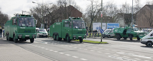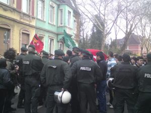 Die Neonazis müssen sich vor dem Aufmarsch von der Polizei an der Warbrucker- / Ecke Goebenstraße durchsuchen lassen.