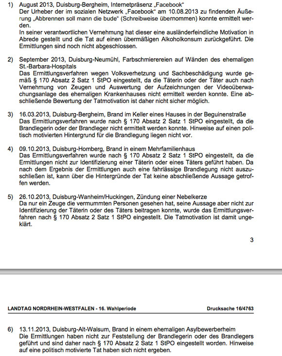 Hier die Antworten auf die Anfrage von Rydlewski zu den einzelnen Brandstiftungen: