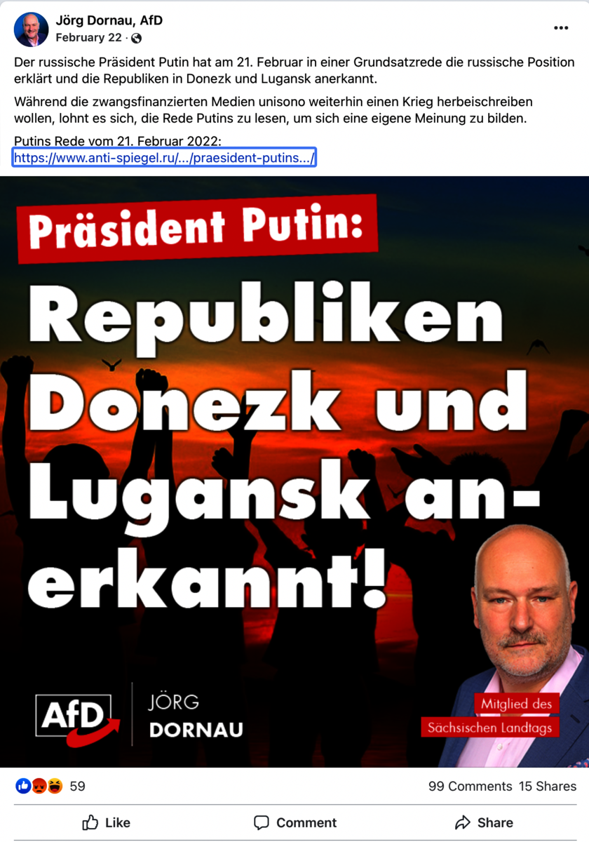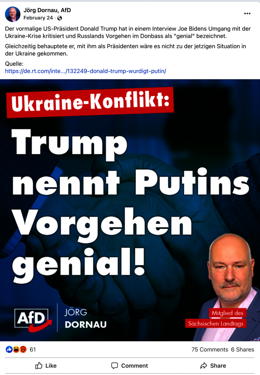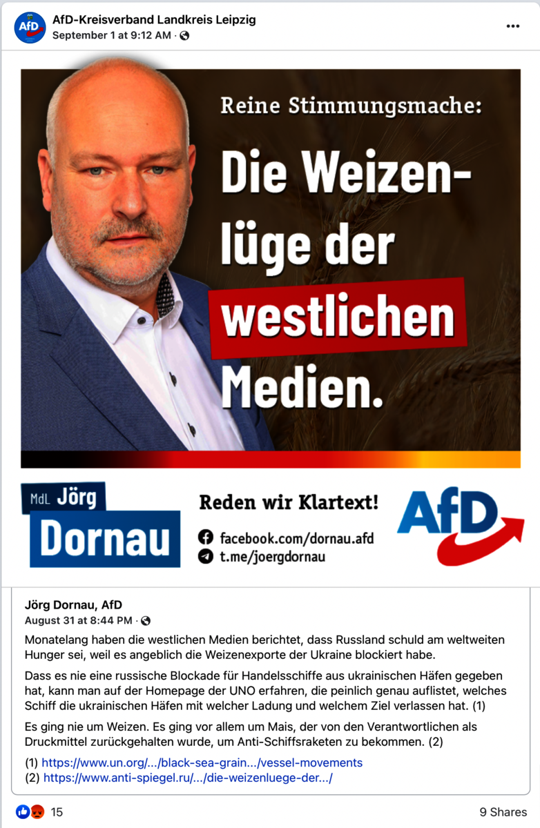 Seit Beginn des Ukraine-Krieges fällt die AfD im Landkreis Leipzig und ihr stellvertretender Vorsitzender, Jörg Dornau (Mitglied des sächsischen Landtages), auf Facebook durch extrem viel Verständnis für Russlands „Spezialoperation“ auf: Die bevorzugten Quellen bei den Postings sind Russia Today und die Website „Anti-Spiegel“, die von Thomas Röper aus St. Petersburg aus betrieben wird. Beide Quellen fallen unter die Kategorie „Russische Fake-News-Schleudern“.