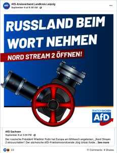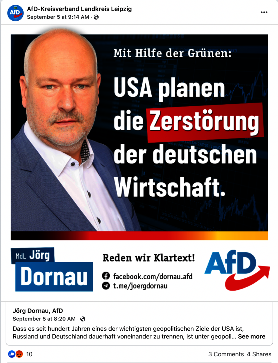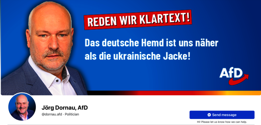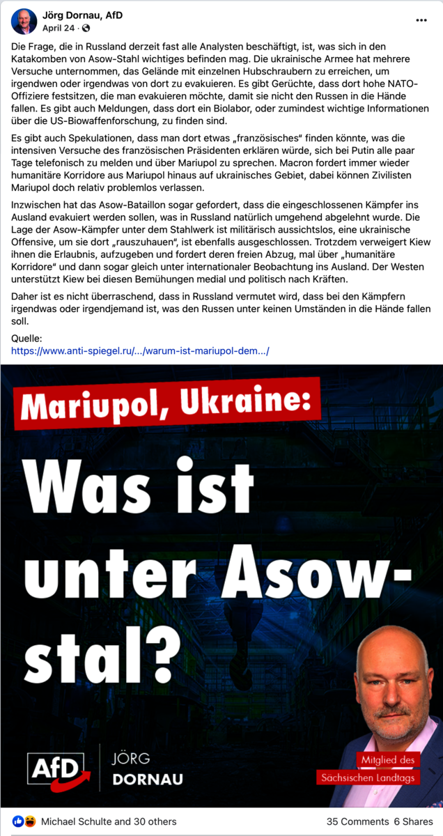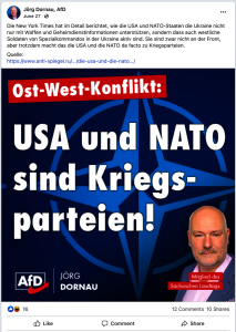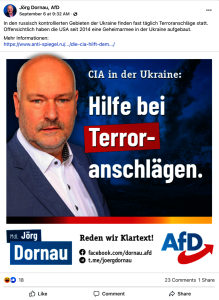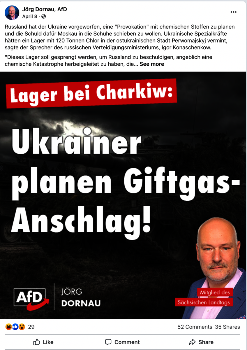 Seit Beginn des Ukraine-Krieges fällt die AfD im Landkreis Leipzig und ihr stellvertretender Vorsitzender, Jörg Dornau (Mitglied des sächsischen Landtages), auf Facebook durch extrem viel Verständnis für Russlands „Spezialoperation“ auf: Die bevorzugten Quellen bei den Postings sind Russia Today und die Website „Anti-Spiegel“, die von Thomas Röper aus St. Petersburg aus betrieben wird. Beide Quellen fallen unter die Kategorie „Russische Fake-News-Schleudern“.