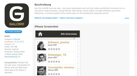 Galore, der legendäre Interview-Ableger des Magazins Visions aus Dortmund, hat kurz vor Weihnachten eine App veröffentlicht. Gedruckt ist Galore zwar Geschichte, digital lebt das Magazin jedoch weiter.