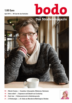 Titelthema: Martin Fromme ist Teil des Comedy-Duos „Der Telök“, TV-Moderator, Schauspieler und Buchautor. bodo sprach mit ihm über Behinderung, die Medien, seine Kindheit in Herne-West und ein Rentnerleben an der Nordsee. Außerdem stellt die Redaktion sein Buch „Besser Arm ab als arm dran“ vor, einen bitterbösen „Behinderten-Knigge“.