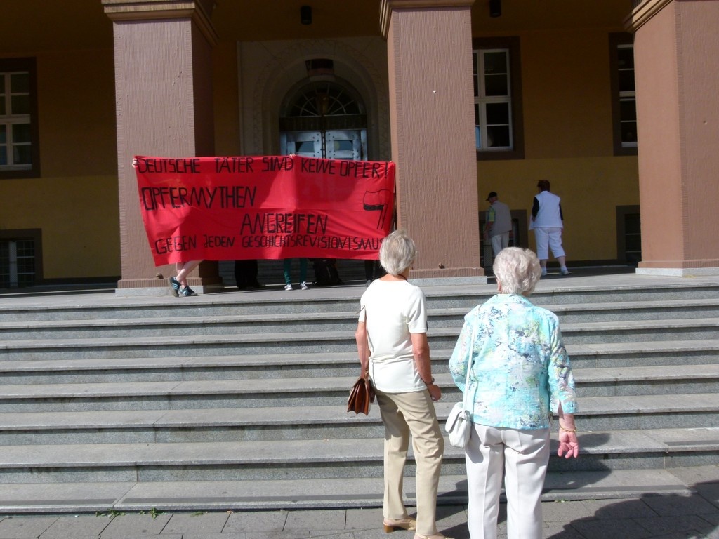 Gegen derlei Aktivitäten, die ihrer Meinung nach nichts als NS-Verherrlichung und Täter-Opfer-Umkehr sind, protestierte am Sonntag eine Gruppe Antifaschistinnen vor dem Wittener Rathaus. Auf einem Transparent forderten sie „Opfermythen angreifen!“ Sie wenden sich auch gegen die beständige Alimentierung des BdV aus öffentlichen Mitteln. Diese resultiere laut Kritikern auch aus dem Frisieren von Mitgliederzahlen. „Ihre Mitgliederstärke erreicht der Verband auch dadurch, dass er den Status des ‚Vertriebenen‘ an die jeweils nächste Generation vererbt“, sagt Tessa König. So würde die Zahl der „Vertriebenen“, auch 67 Jahre nach Kriegsende, stetig wachsen.