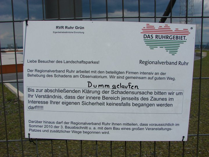 Arnold, durch Pfusch bedingter Schrott ist natürlich extrateuer. Für meine o. erwähnte Halde in Dortmund wurden 50.000 Euro für Wege und eine Aussichtsplattform verbaut, aber innerhalb weniger Monate durch Vandalismus ebenso wieder "versenkt". Nur – hier kümmert es Niemanden, dass das Gelände viele Jahre lange wieder zur Brache mutierte und dass die Auswaschungen der angelegten Wege es noch nicht mal mehr als "Danger Area" für BMX-Freaks taugen lassen. Kein Lokalpolitnik, kein örtlicher Sponsor oder sonst wer bekommt hier den Ar… hoch, um daraus was zu machen. Und da finde ich das Projekt (Gesamt-)Hoheward/Observatorium trotz dieser Pleite doch hundert mal engagierter, bürgernäher und ideenreicher.