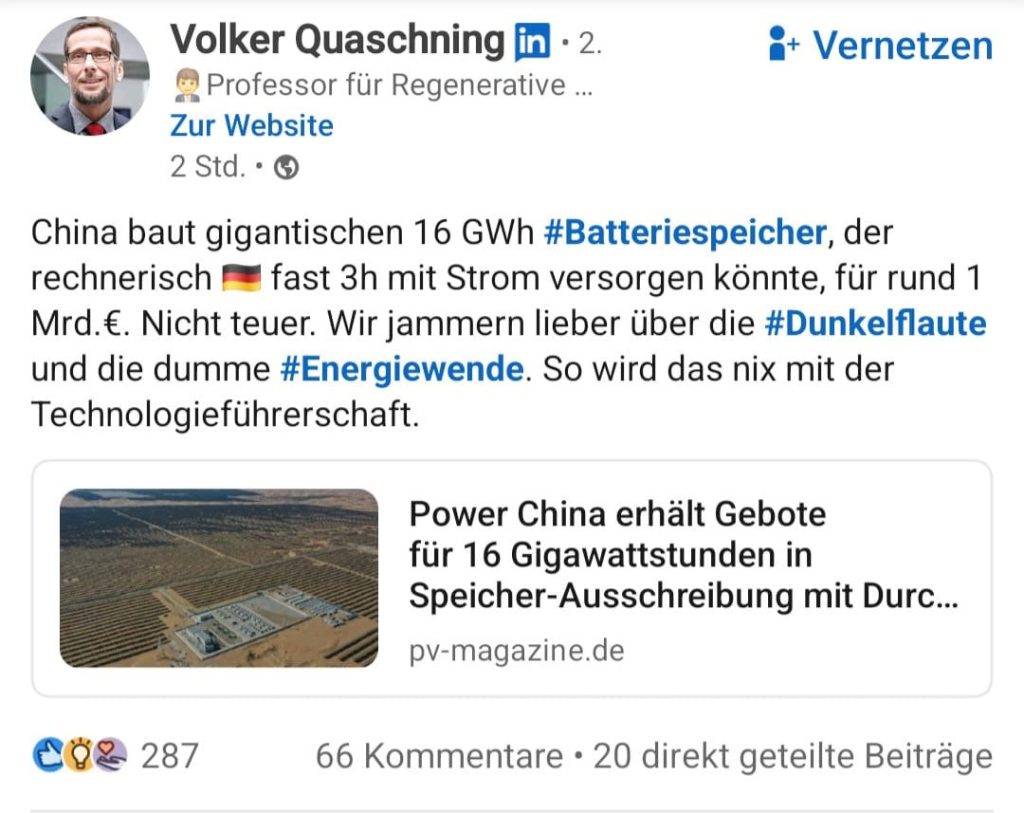 Professor Volker Quaschning behauptet heute bei LinkedIn, der gigantische 16 GWh Speicher in China könne Deutschland drei Stunden mit Strom versorgen. Nicht teuer, aber wir jammern eben nur.
