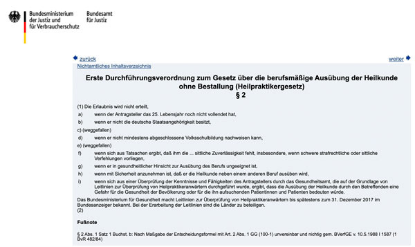 Der nächste unredliche Pseudovergleich ist der bezüglich der Zugangsvorraussetzungen für die Prüfung als HP einerseits, und die die Vorraussetzungen für das Bestehen der Arztzulassung andererseits. Wieder zwei völlig verschiedene Sachverhalte. Redlich wäre es gewesen, entweder die Vorraussetzungen für eine staatliche Anerkennung oder aber die Vorraussetzungen für eine Zulassung zur Prüfung zu vergleichen. Dafür hätte Sie aber recherchieren müssen … Eine glatte Falschaussage ist ihre Behauptung, als Heilpraktiker benötige man keine Ausbildung. Tatsache: ohne medizinische Ausbildung kann kein HP-Anwärter die Überprüfung bestehen, denn es wird das medizinische Wissen des 2. Staatsexamens abgefragt. Probieren Sie doch mal aus, wie lange Sie brauchen würden, um das zu lernen …