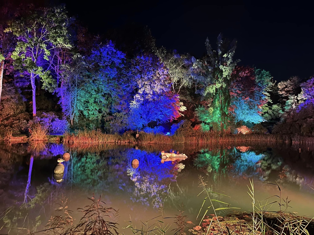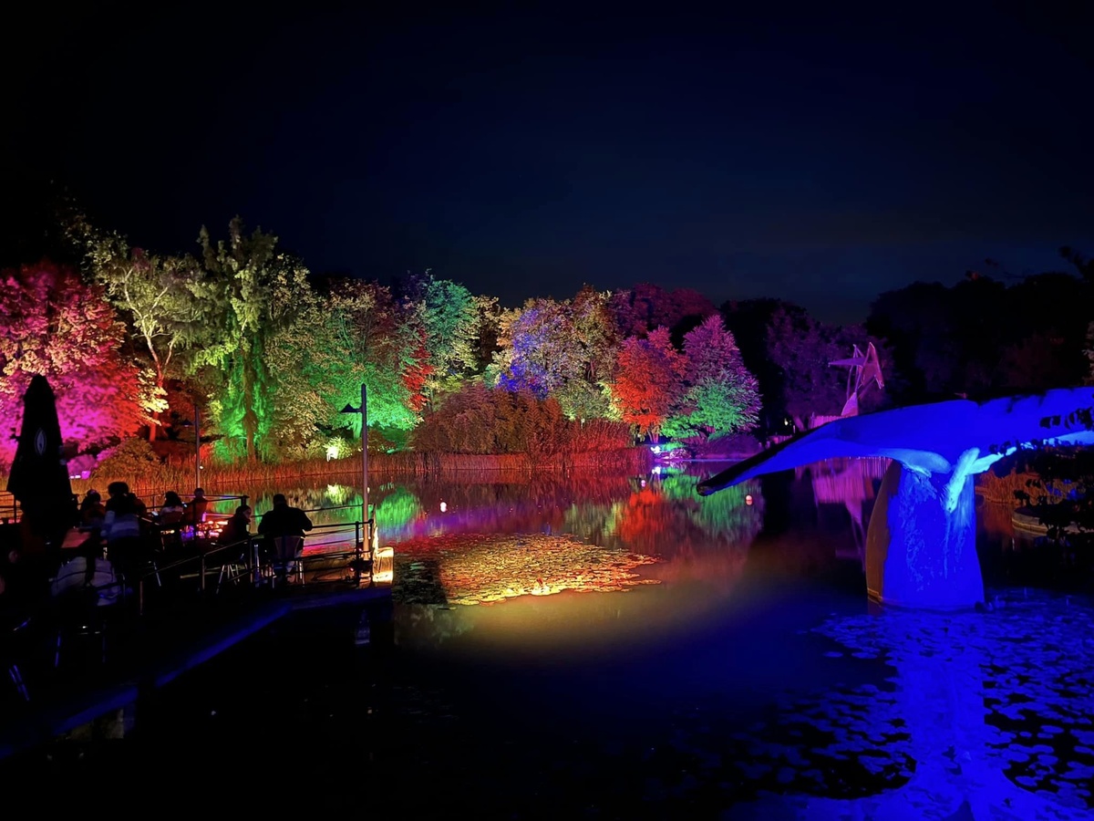 Verfolgt man die Route der Illuminationen gelangt man im Norden des Parks zu den Videoprojektionen am auch überregional bekannten Glaselefanten. Hochkomplexe Programme werden hier passgenau auf die Fassade projiziert. Wenige Meter weiter taucht man in die gewaltige Farbenpracht des Sees ein. Insbesondere hier lohnt es sich aus meiner Sicht ein paar Minuten zu verweilen und die Farbfaszination voll auf sich wirken zu lassen.