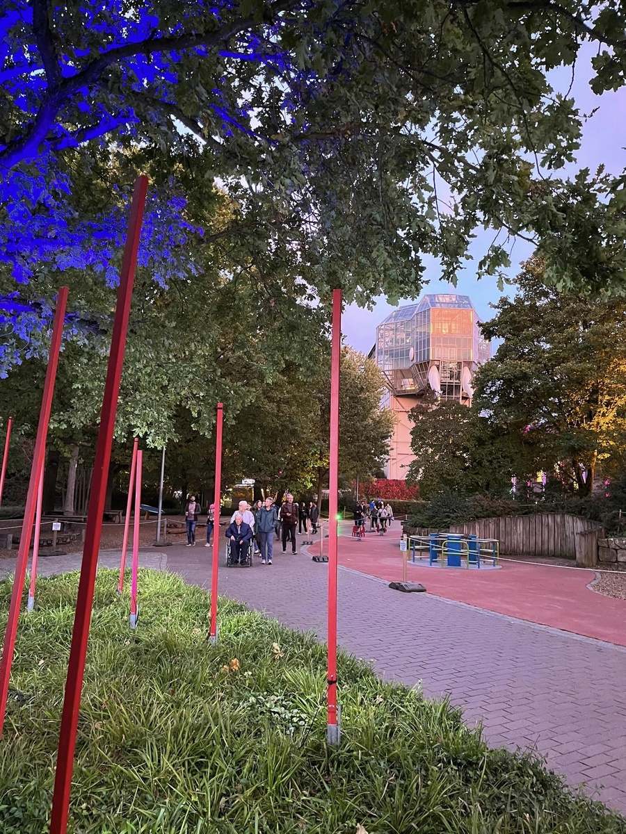 Ich traf am Freitag noch im Hellen in Hamm ein, so dass meine erste Runde durch das Gelände noch bei etwas Tageslicht stattfand. Die Lichtobjekte entfalten ihre volle Wirkung jedoch nur mit Einsetzen der Dämmerung. Mein zeitiges Eintreffen hat sich im Nachhinein aber sogar als Vorteil herausgestellt, konnte ich so doch noch den Maxipark bei Tageslicht sehen. Und ich konnte somit die sich verstärkende Wirkung des Lichts während meines Aufenthalts bei einsetzender Dunkelheit auch so richtig wahrnehmen und genießen.