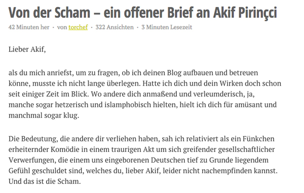 […] "Ich schäme mich nicht nur fremd, für dich, Freund Akif" (Ruhrbarone) – Der Webmaster von Akif Pirincci will nicht mehr für ihn arbeiten und begründet das in einem offenen Brief. […]