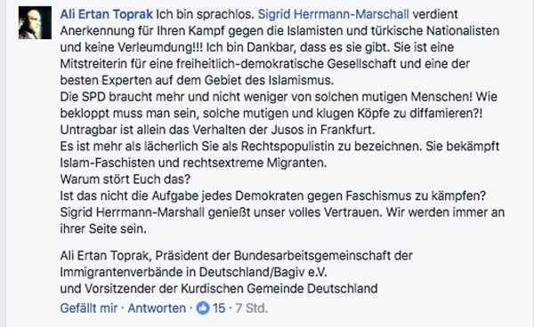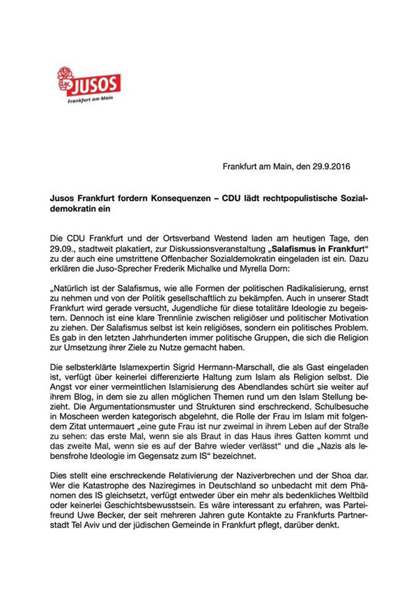 Die Offenbacherin Sigrid Herrmann-Marschall betreibt das Blog „Vorwärts und nicht vergessen“ und macht auch bei den Ruhrbaronen mit. Sie setzt sich seit Jahren immer wieder gegen Islamisten ein und ist die Organisatorin einer Mahnwache gegen Islamisten in Frankfurt. Dort muss sie sich regelmässig von den Anhängern der Zauselbärte beschimpfen und bedrohen lassen. Herrmann-Marschall wird den Vorwurf nicht im Raum stehen lassen: „Der Vorwurf hat mich menschlich getroffen, weil er haltlos ist und meine Absichten verdreht. Zu diesem Zweck werden Aussagen von mir sinnentstellend verwendet, was ich besonders verwerflich finde. Ich kann mit einer Gegenmeinung und einer Gegenhaltung umgehen und toleriere sie. Aber diese andere Meinung muss auf meinen real existierenden Haltungen beruhen und nicht auf einem Reflex, der sich an buzz words reibt. Ich habe diese beiden Jusos angezeigt, weil sie ihre Stellung missbraucht haben, um mir in der Öffentlichkeit – die Stellungnahme ging wohl an alle Redaktionen im Juso-Presseverteiler – wahrheitswidrig in bösartiger Manier übel nachredeten. Das ist nicht mehr akzeptabel und wird auch nicht mehr vom Recht auf freie Meinungsäußerung abgedeckt.“