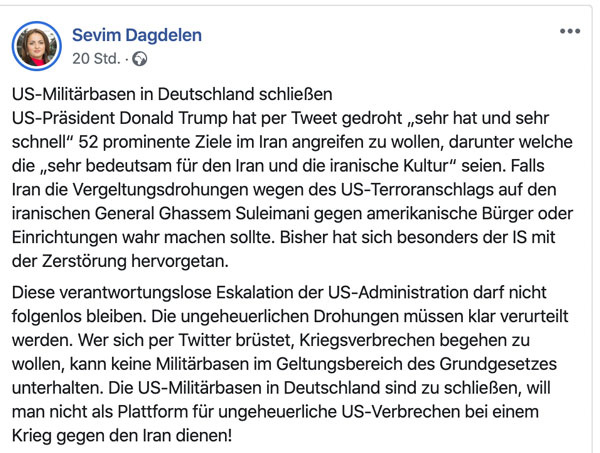 Voigts Ängste, US-Stützpunkte in Deutschland könnten zum Kampf gegen eine Regime genutzt werden, das Schwule an Baukränen aufhängt, Israel mit Vernichtung droht und Feministinnen für Jahrzehnte in Folterknästen einsperrt, teilt auch die Bundestagsabgeordnete Sevim Dagdelen (Linke). Sie schlägt deshalb vor, die US-Stützpunkte in der Bundesrepublik zu schließen: