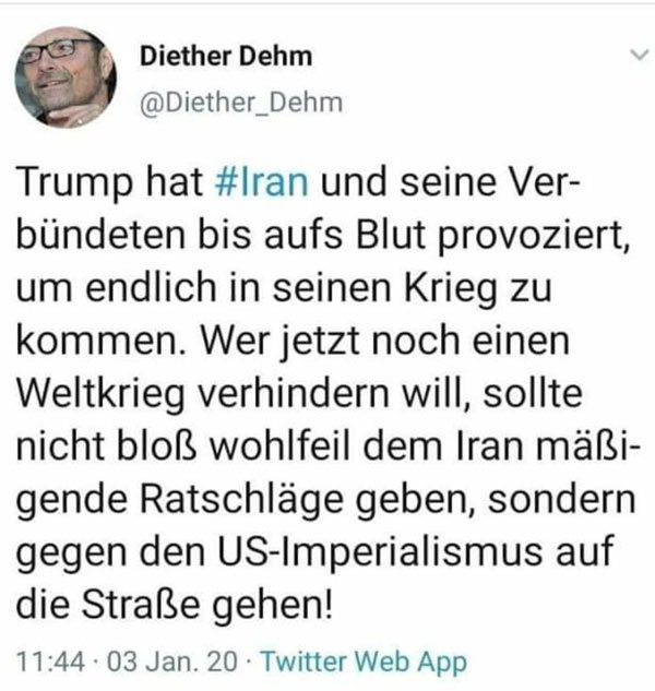 […] Stefan Laurin hat gestern hier im Blog die Querfront nach dem Ableben des iranischen Top-Terroirsten Qasem Soleimani thematisiert. Die Reaktionen der üblichen Verdächtigen wenn es um US-Bashing geht, Dieter Dehm (Die Linke) und Udo Voigt (NPD), haben nun nicht wirklich überrascht. Und ärgern mich auch nicht wirklich. Es war zu erwarten. Dem Beitrag ist nichts hinzuzufügen. […]