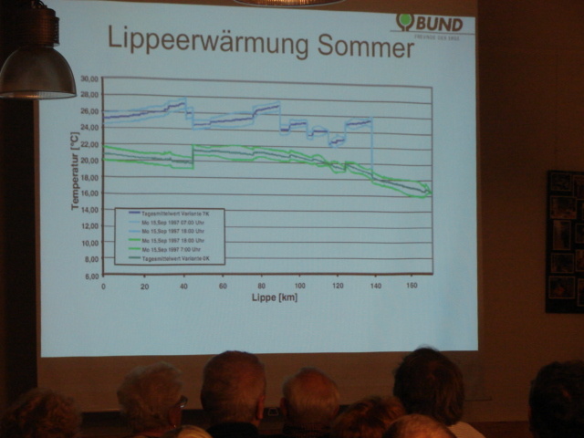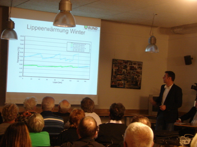 Der Kraftwerksexperte des BUND zeigte anhand von Grafiken, wie sehr u.a. die Temperatur der Lippe unter den Kraftwerken leide, und welche Gefahren den umliegenden Wäldern durch die drohenden zusätzlichen Emissionen aus Datteln 4 und Trianel in Zukunft noch drohen könnten.