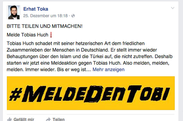 Für viele Islamisten ist das kein Grund mit Huch zu streiten und zu debattieren, sondern ihn mundtot zu machen. Sie rufen über die FB-Gruppe „Islamhetzer melden“ dazu auf, sich über Huch bei Facebook zu beschweren. Das Ziel: Seine Facebook-Seite soll gelöscht werden. Da Facebook im Ruf steht, auf solche Beschwerden ohne eine inhaltliche Kontrolle zu reagieren, stehen ihre Chancen nicht schlecht. Eifrig dabei ist auch ein alter Bekannter der Leser dieses Blogs: Erhat Toka, Islamist aus Osnabrück, mahnte im vergangenen Jahr dieses Blog ab, weil wir ihn als Islamisten bezeichnet haben. Wir machten damals deutlich, dass uns die Abmahnung eher belustigt und nicht besorgt und hörten nichts mehr von ihm und seinem Anwalt. Huch lässt sich indes nicht beeindrucken: „Jeden Tag erlebe ich Anfeindungen von Menschen, die unsere Art zu leben hassen. Seien es Salafisten, Islamisten, ISIS-Anhänger, Graue Wölfe, Neonazis oder fanatische Erdogan-Anhänger. Alle vereint der Hass auf die Freiheit und die Verachtung der Demokratie. Aber genau diese Anfeindungen bestätigen mich in meinem Handeln und sind Motivation neben den natürlich tausenden positiven Zuschriften und nennen 200.000 Unterstützerinnen und Unterstützern.“