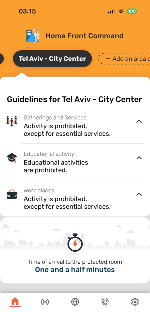Home Front Command App: Versammlungen und Gottesdienst: Aktivitäten sind verboten, mit Ausnahme von wesentlichen Dienstleistungen Bildungsaktivitäten: Bildungsaktivitäten sind verboten Arbeitsplätze: Aktivitäten sind verboten, mit Ausnahme von wesentlichen Dienstleistungen (Screenshot)