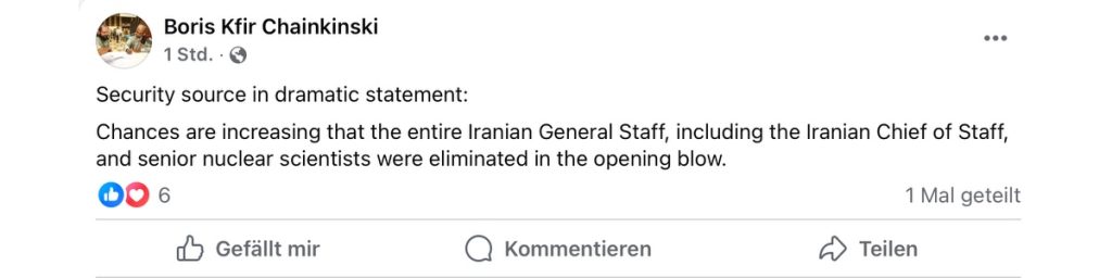 Die Wahrscheinlichkeit steigt, dass der gesamte iranische Generalstab, einschließlich des iranischen Generalstabschefs, und hochrangige Atomwissenschaftler bei dem ersten Schlag eliminiert wurden.