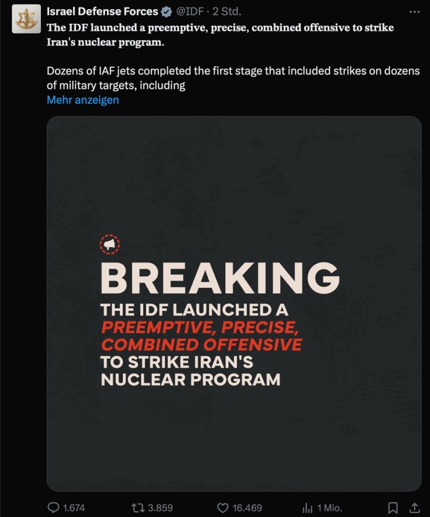 Dutzende Jets der israelischen Luftwaffe haben die erste Phase abgeschlossen, die Angriffe auf Dutzende militärische Ziele, darunter auch Nuklearziele in verschiedenen Regionen des Iran, umfasste. Heute ist der Iran näher denn je daran, eine Atomwaffe zu erwerben. Massenvernichtungswaffen in den Händen des iranischen Regimes sind eine existenzielle Bedrohung für den Staat Israel und die ganze Welt.