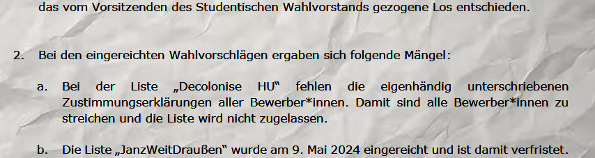 Die Liste der Gruppe „Decolonise HU“ darf nicht an der diesjährigen Wahl zum Studierendenparlament teilnehmen. Der Studentische Wahlvorstand teilte in einer amtlichen Bekanntmachung vom 17. Mai 2024 mit, dass bei der Einreichung der Wahlvorschläge eigenhändig unterschriebene Zustimmungserklärungen aller Bewerber fehlten. Konsequenz: Die gesamte Liste wurde gestrichen.