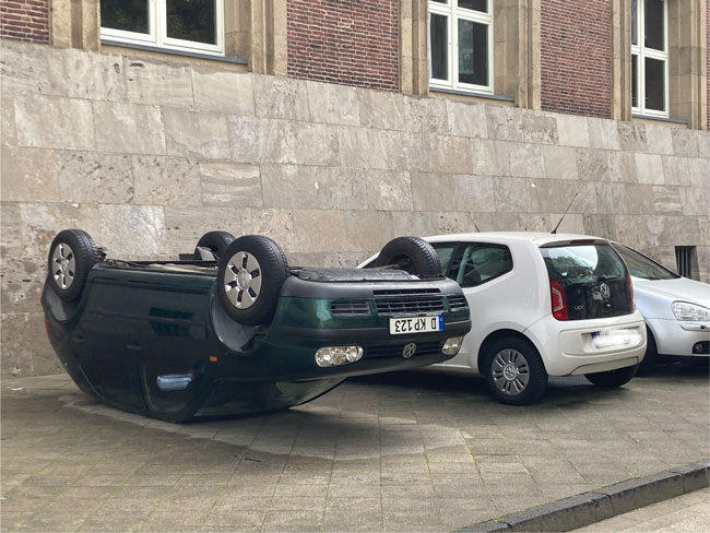 Es beginnt bereits vor dem Kunstpalast. Drei säuberlich geparkte Autos, stehend auf ihren Reifen, und das vierte in der Reihe – liegt auf dem Dach!