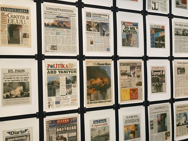 Wie Feldmann auch gravierende gesellschaftspolitische Ereignisse künstlerisch umgesetzt hat, zeigt sich in der Collage 9/12 Titelseiten (2001 – 2008). Am Tag nach dem Attentat auf das New Yorker World Trade Center am 11. September 2001 ging Hans-Peter Feldmann in die Buchhandlung des Düsseldorfer Hauptbahnhofs und kaufte internationale Zeitungen, die über diesen Anschlag berichteten, eben am 12. September 2001. Aus 151 Titelseiten entstand auf diese Weise eine Collage, die, je nach Schwerpunkt der einzelnen Tageszeitungen, eine eindrückliche und spannungsreiche Momentaufnahme dieses weltweit dokumentierten Attentats, wiedergibt. Auch hier liegt das „Archivieren und Arrangieren“ als Arbeitstechnik zugrunde.