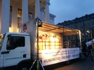17.20 Uhr: Die ersten Informationen aus Duisburg. Vor dem Hauptbahnhof soll gleich die Demonstration des Duisburger Netzwerkes gegen Rechts beginnen. Vor wenigen Minuten waren es ca. 120 Leute, die sich dort bereits versammelt hatten und einen stetigen Zulauf erhalten. 600 Meter von dort entfernt, vor dem Theater Duisburg ist man noch nicht so weit und baut noch in aller Ruhe auf.