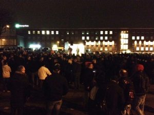 19.39 Uhr: DUIGIDA nähert sich wieder dem Hauptbahnhof und trifft dort auf lauten Gegenprotest. Nur 50 Meter liegen zwischen den Gegendemonstraten und DUIGIDA. Polizisten haben z.T. die Helme aufgesetzt.
