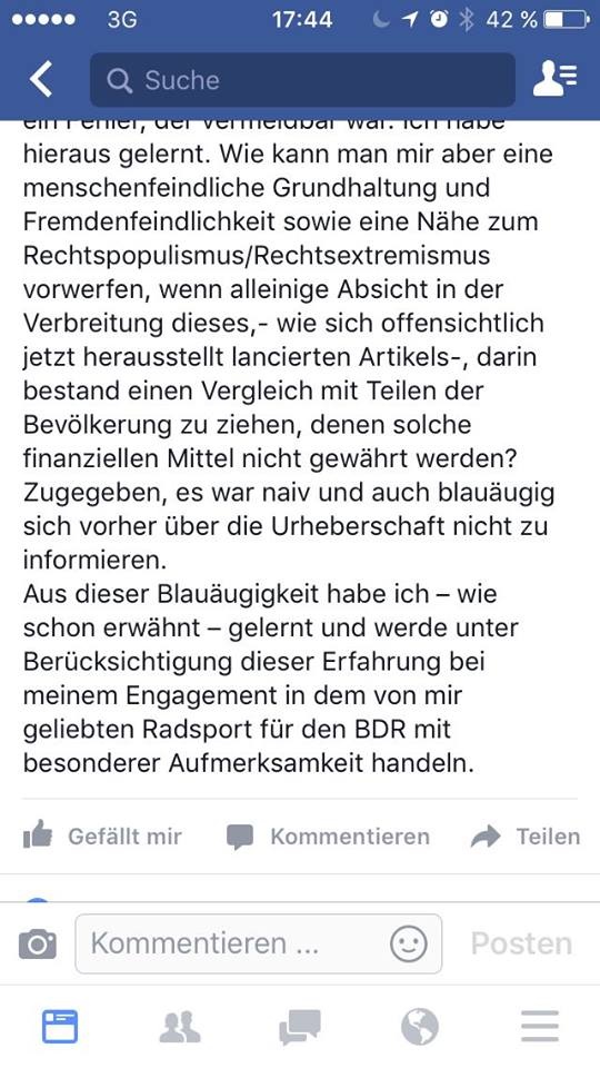 „Der Bund Deutscher Radfahrer distanziert sich klar und eindeutig von den Facebook-Posts, die unser Stellvertretender Präsident Peter Streng auf seiner privaten Facebook-Seite geteilt hatte.