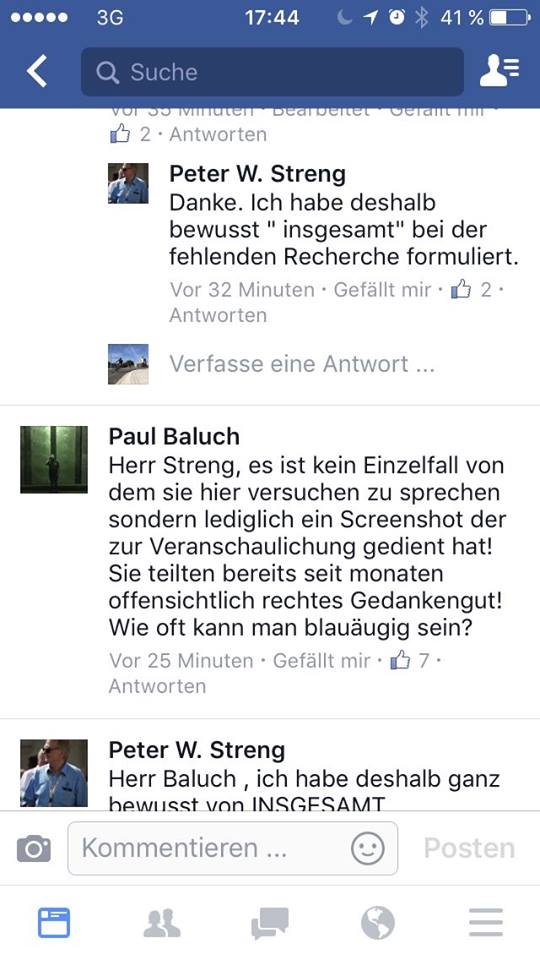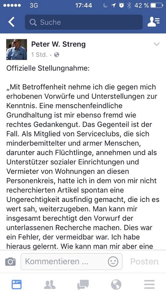 Auch Peter W. Streng äußerte sich zu den Vorwürfen via „facebook“. Der Beitrag ist, so wie alle in Rede stehenden rechtspopulistischen Äußerungen, entweder inzwischen gelöscht oder der Öffentlichkeit unzugänglich gemacht worden.