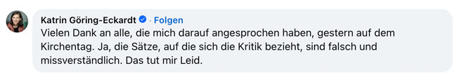Auf dem gestern in Hannover eröffneten Evangelischen Kirchentag wurde Katrin Göring-Eckardt auf den Ruhrbarone-Beitrag angesprochen. Mit einem verifizierten Account kommentierte sie daraufhin unter unserem Facebook-Post: