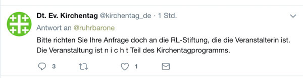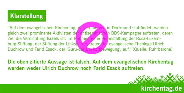 Obwohl aus dem Veranstaltungshinweis klar hervorgeht, dass Esack und Duchrow auf dem Kirchentag auftreten und das man nur mit Kirchentags-Eintrittskarte an der Veranstaltung teilnehmen kann, zeigte sich der Kirchentag immer noch uneinsichtig: